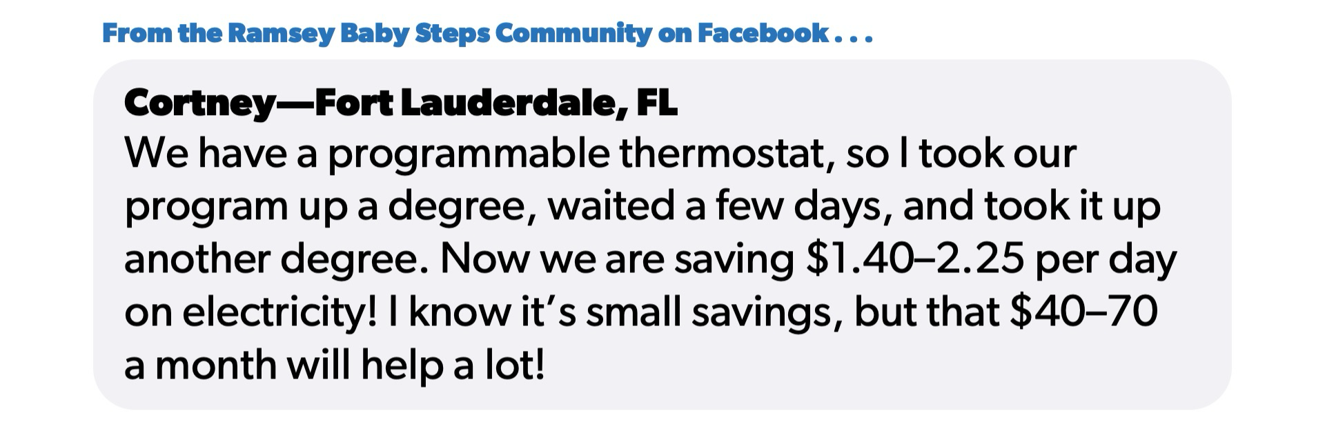 “We have a programmable thermostat,” said Cortney, one of the members of the Ramsey Baby Steps Community on Facebook. “So I took our program up a degree, waited a few days, and took it up another degree. Now we are saving $1.40–2.25 per day on electricity! I know it’s small savings, but that $40–70 a month will help a lot!”