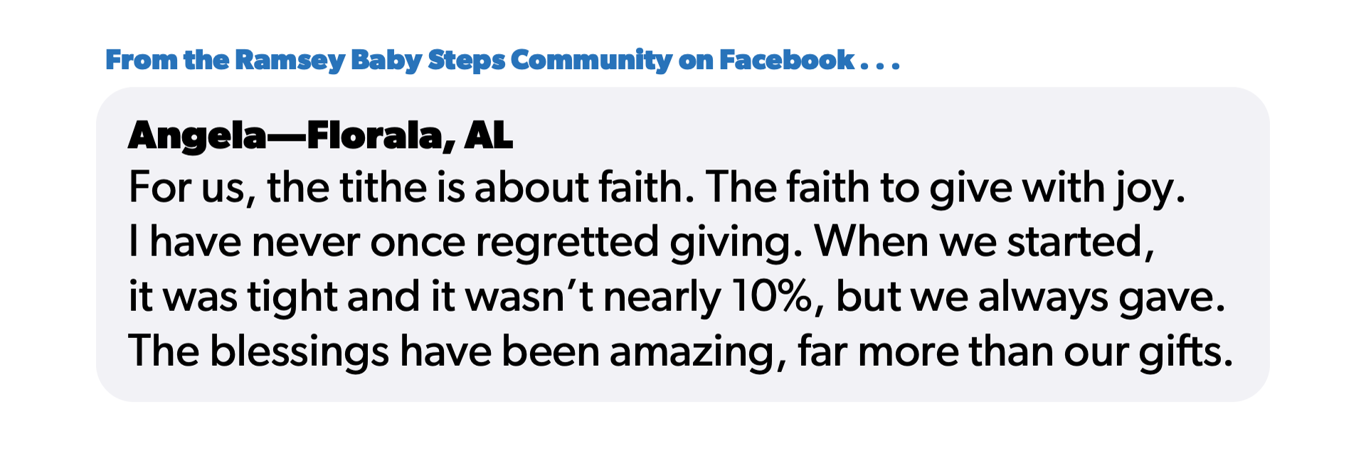 “For us, the tithe is about faith. The faith to give with joy,” Angela said in her comment in the Ramsey Baby Steps Community. “I have never once regretted giving. When we started, it was tight and it wasn’t nearly 10%, but we always gave. The blessings have been amazing, far more than our gifts.”