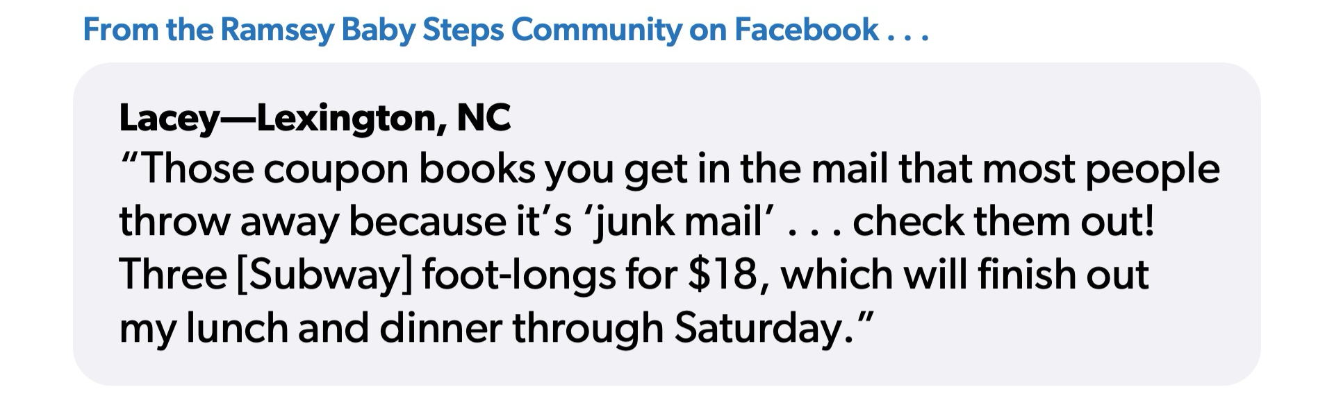 Coupons also come in the old-fashioned regular mail too—and just like your email inbox, they can also clog up your actual mailbox. But Lacey, one of the members of our Ramsey Baby Steps Community on Facebook, says that you shouldn’t just throw away those annoying ads.