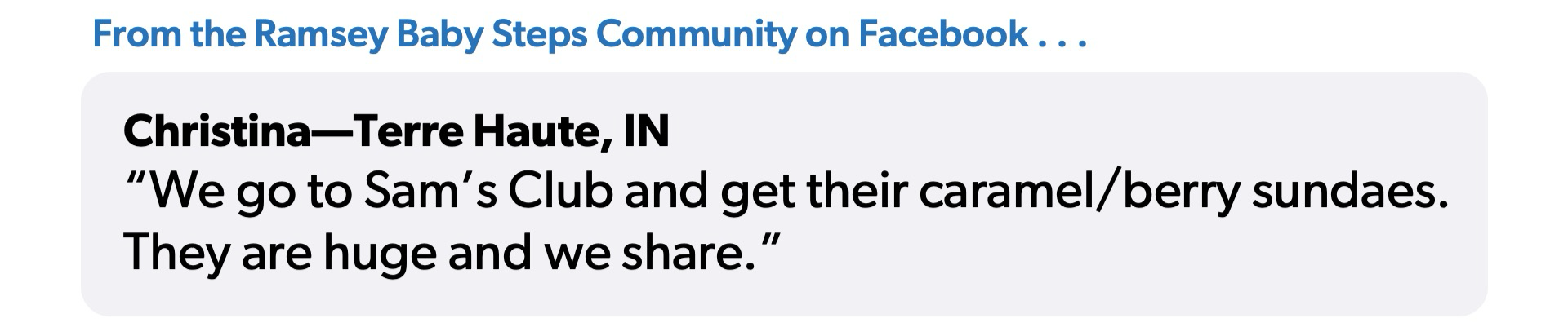 Christina, another of our Ramsey Baby Steps Community members, takes advantage of the amazing (and cheap) desserts available at her local warehouse club store. “We go to Sam’s Club and get their caramel/berry sundaes,” Christina said. “They are huge and we share.”