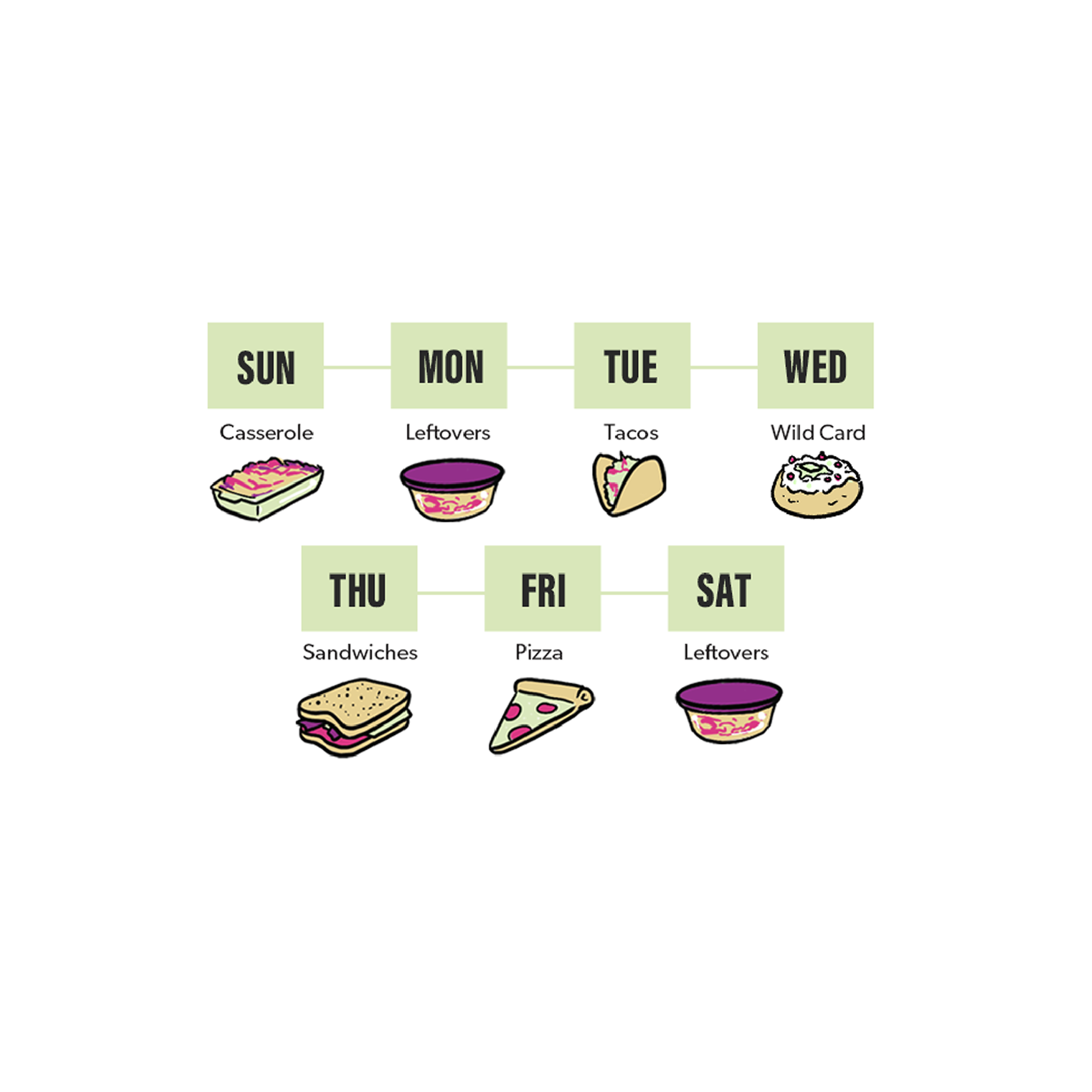 To eliminate decision fatigue, give each night of the week a general meal theme or category. For example, maybe Sunday is always casserole night or Friday is always pizza night. When I’m picking my themes, I only plan to cook up to four nights a week (plus one night where I’m making something that involves easy assembly instead of actual cooking, like sandwiches). The rest of the nights are for leftovers. I call this my Cook Four, No More rule because, honestly, cooking any more than that is just doing too much.