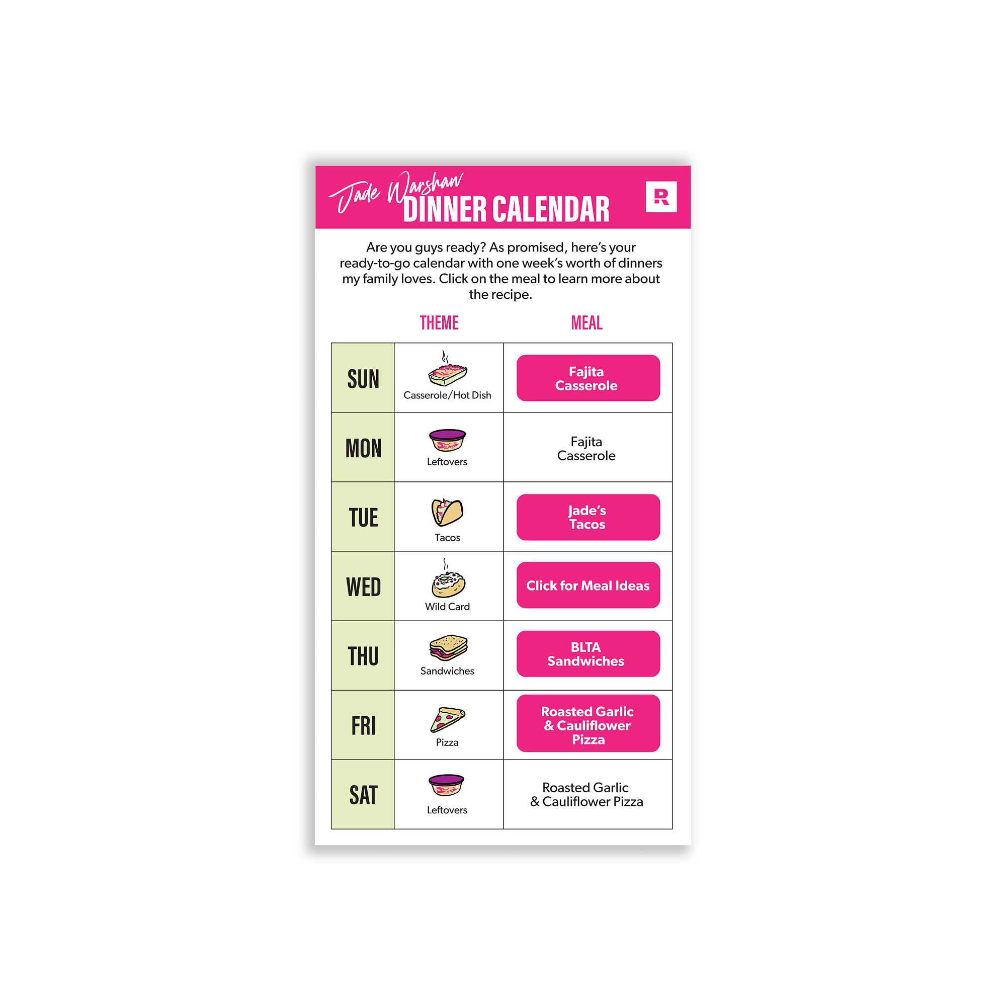 This is the fun part. I’ve planned out a dinner calendar with a whole week of meals based on what a typical week looks like for my family, featuring some of my favorite time-tested, kid-approved dishes. So if you want to take some of the thinking out of dinner, follow my example week! (Recipes are designed for a family of four—modify to fit your family as needed.) I also made you a grocery list with all the ingredients you’ll need to make this full week of meals.