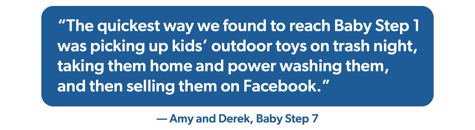 “The quickest way we found to reach Baby Step 1,” they said, “was picking up kids’ outdoor toys on trash night, taking them home and power washing them, and then selling them on Facebook.”