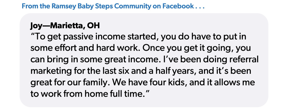 That initial effort matters. As one member of the Ramsey Baby Steps Community Facebook group shared, “To get passive income started, you do have to put in some effort and hard work. Once you get it going, you can bring in some great income. I’ve been doing referral marketing for the last six and a half years, and it’s been great for our family. We have four kids, and it allows me to work from home full time.”